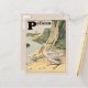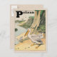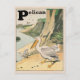 Pelican am Strand am Meer mit anderen Vögeln, die in der Luft zwischen den Felsen über dem Ozean fliegen. Alphabet Brief P ist für "Pelican", gedruckt oben auf der Postkarte in fett gedruckten Briefen, um Kindern und ESL-Schülern zu helfen, ihre ABCs zu lernen.