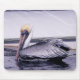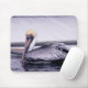 Profil eines Pelikans - das braune Pelikan auf dem Originalfoto von MaeFlowers auf dieser Mousepad gleitet entlang des Wassers eines Kanals an der Golfküste von Florida. Die Seite eines Bootes im Hintergrund zeigt die schimmernden Reflexionen des blauen Wassers. Das Foto ist in Blues-, Weich- und Braun-Tönen gehalten, auf dem Kopf des Pelikans ist eine gelbe Touch.