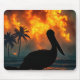 Ein Pelikan steht auf einem Strand, der von einem blühenden Feuer am Horizont gedämpft wird