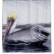 Profil eines Pelikans - der braune Pelikan im Foto auf diesem Duschvorhang gleitet entlang dem Wasser eines Kanals auf Floridas Golf-Küste. Die Seite eines Bootes im Hintergrund zeigt die schimmernden Reflexionen des blauen Wassers. Das Foto ist in den Schatten der Blues, weiche Grau und Braun, mit einer Touch des Gelbs auf dem Kopf des Pelikans.