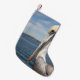 Grauer pazifischer Pelikan mit blauem Himmel und Wasser im Hintergrund.
