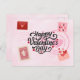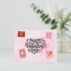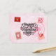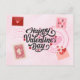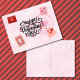 Send your pen pal(s) Happy Valentine's Day wishes with this snail mail designed postcard. The front features a mail mark, decorated envelopes, and stamps. The colors run the spectrum from deep red to light pink.
