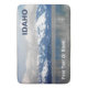 Blick nach Osten von Sandpoint, ID über den See Pend Oreille (Teich äh-ray) an einem Wintertag; schneebedeckte Berge in der Ferne. Eis hat sich am Ufer gebildet und erstreckt sich teilweise über den See. Blues und Grau sind die vorherrschenden Farben. Es erscheint auch das Textlesen "IDAHO". Und sie sind ein Ort, um zusätzlichen Text hinzuzufügen.