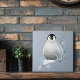 Ein niedlicher Pinguinkick mit Schnee und Schneeflocken in hellblau grauer Kulisse, alles gezeichnet im Jugendstil