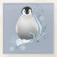 Ein niedlicher Pinguinkick mit Schnee und Schneeflocken in hellblau grauer Kulisse, alles gezeichnet im Jugendstil