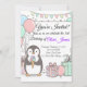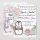 Feiern Sie Ihren 3. Geburtstag mit einem niedlichen Pinguin in einem Party Hut, Pastellballons und Konfetti! Ideal für Party im Winter- oder arktischen Stil, mit Aquarellcharme und Platz, um den Namen, das Datum und die Lage Ihres Kindes hinzuzufügen. Spaß, skurril und bezaubernd!