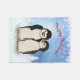 Adorable Pinguin Paar auf schneebedecktem Boden mit Kiefernwald und blauem Himmel im Hintergrund. Happy Holidays kann angepasst oder gelöscht werden, wenn nicht gewollt.