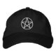 Ein weißes Pentagramm Stickereidesign auf einem reinen schwarzen Hut.