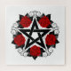 Schwarzes Pentagramm mit Muster, mit Blüte dekoriert, rote Rosen mit Blätter auf weißem Hintergrund. Tattoo-Stil.