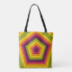 Dieses Bild ist ein abstraktes geometrisches Design mit konzentrischen Pentagons in lebhaften, abwechselnden Farben. Die Pentagons sind ineinander verschachtelt und erzeugen einen Tunnelartigen hypnotischen Effekt, der das Auge in Richtung Zentrum zeichne. Die Farbpalette umfasst fette Farbtöne wie Magenta, Orange, Gelb, Olivgrün und Dunkelblau lila, wodurch das Ganze ein Retro-psychedelisches Ambiente erhält.