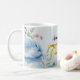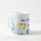 A watercolour blue peony 70th Birthday coffee mug. This milestone birthday celebration mug features stunning peonies in a variety of shades of blue. If the lady likes blue, this is the mug to make her day.