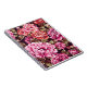 A vibrant array of pink and orange peonies is artfully arranged against a dark background, creating an eye-catching and colorful floral pattern. The detailed blossoms are interspersed with rich green leaves, enhancing the lush appearance.
