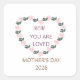 A soft watercolor heart made of blush pink peonies and airy green leaves frames the heartfelt message “Mom You Are Loved” in gentle plum lettering. A muted gold year rests beneath the floral heart and can be updated through the editable template, making these stickers a sweet way to add warmth to cards, gifts, or Mother’s Day packages. The delicate botanical artwork brings a tender, feminine touch to every surface.
