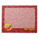 Roter Chili Pfeffer mit Flammenkreis auf herausnehmbarem nahtlosem Musterhintergrund. Eigener Text.