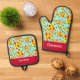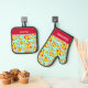 Stilvolle Ofenhandschuhe und Topfhalter mit farbenfrohen roten und blauen Mustern von Pizza-Scheiben aus Pepperoni. Beide verfügen über einen benutzerdefinierbaren Text zum Hinzufügen eines eigenen Namens oder einer eigenen Nachricht.