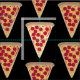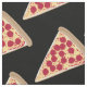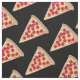 Dieser Stoff ist perfekt für Pizzafreunde. Die Grafik einer Scheibe Pepperoni Pizza erscheint im Muster auf einem schwarzen Hintergrund.