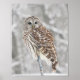 Eine Eule hisste in einem Schneesturm. Auch wenn es schneien mag, ist diese kühn gefärbte Eule im fallenden Schnee sichtbar. Er sitzt bereit, um einen Augenblick den Flug zu nehmen; er beobachtet die Entfernung für seine nächste Beute.