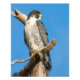 Ein Wanderfalke, der auf einem toten Baumzweig an einem blauen Himmel steht.