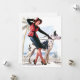 Elvgren Button Up Girl Art. Eine stilvolle Frau, die ein rotes und schwarzes Outfit trägt, hält selbstbewusst die Leine eines großen Hundes an einer Strandpromenade. Eine Palme und das Meer bilden einen tropischen Hintergrund, der die lebendige und moderne Stimmung der Szene verstärkt.