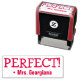 Dieses positive Design aus Gummi-Briefmarke zeichnet sich durch die Motivationsbotschaft "PERFECT!" und den Namen eines individuellen Lehrers aus. Es könnte von einem Lehrer, Pädagogen oder Tutor verwendet werden, um zu bestätigen, dass der Schüler gut abgeschnitten hat.