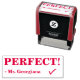 Dieses lustige Design aus Gummi-Briefmarke beinhaltet die Motivationsbotschaft "PERFECT!" und den Namen eines Lehrers, Lehrers oder Tutor. Es ist auch mit einem dekorativen Karo versehen. Es könnte von einem Lehrer, Pädagogen oder Tutor verwendet werden, um anzuzeigen, dass der Schüler gut abgeschnitten hat.
