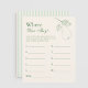 Unterhalten Sie die Gäste mit diesem Perfect Pear Brautparty Where Were It - der Spielkarte mit von Hand gezeichnet Birnen, Akzenten im Grünen und eleganter Schrift-Typografie. Eine lustige Aktivität, die die Gäste herausfordert zu erraten, wo das Paar in verschiedenen Augenblicken war, dieses Brautparty zum Birnenthema bringt Gelächter und Interaktion zu Ihrer Veranstaltung. Dieses Brautparty ist perfekt für rustikale, bäuerliche oder im Garten inspiriert Duschen geeignet und verbindet sich wunderbar mit den entsprechenden Einladungen, Schildern und der Perlendekoration.