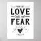 Elegantes Calligraphy Style Scripture Verse Design Emblem in schwarz auf weißem Hintergrund mit Worten: "Perfect Liebe Casts Out Fear". Bibelverse ist 1 John 4:18