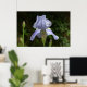 Hübsche Perwinkle-Iris mit weißer Mitte und gelbem Bart und Knötchen, die sich im Hintergrund öffnen lassen. Seide auf zarten Blättern. Grüne Sträucher sind in der Ferne verschwommen. Original Fotografie © TamiraZDesign.
