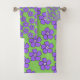 Dieses Handtuchhandtuch-Set hat eine Federkonstruktion eines Feldes mit Blume, die sich in einem grünen Hintergrund befinden.