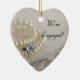Feiern Sie Ihre ersten Weihnachten als verlobtes Paar und begehen Sie den besonderen Tag mit den eleganten Perlen, Ring und Blue Lace Verlobung Round Ornament. Dieses klassische Thema We're Verlobt Ornament zeigt ein Foto von einer weißen Perlenhalskette und Diamant Verlobung Ring mit einem Vintag blau-weiß Spitzen geschnitten Leinen Taschentuch.