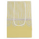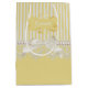 Eine Vintage, Viktorianische Geschenktasche mit gelben goldenen Streifen, geschmückt mit einem Bild eines Elfenbeinfarbenbundes, das in einen Bogen an einer Reihe von eleganten Perlen gebunden ist. Personalisieren Sie dieses mädchenhafte Design, indem Sie Ihren Namen in den verzierten goldfarbenen Rahmen einfügen. HINWEIS: Dies ist ein flaches, gedrucktes Bild. Der Bogen, Spitzen, Perlen und Goldrahmen sind NICHT real.