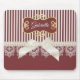 Ein Vintages Mousepad im Viktorianischen Stil mit tiefen, roten und cremefarbenen vertikalen Streifen, die mit einem cremefarbenen Band verziert sind, das an einer Kette von eleganten Perlen in einem süsslichen Bogen befestigt ist. Dieses elegante Design wird durch den Zusatz Ihres Namens zum verzierten goldfarbenen Rahmen individuell gestaltet. HINWEIS: Dies ist ein flaches, gedrucktes Bild. Der Bogen, Spitzen, Perlen und Goldrahmen sind NICHT real.