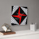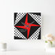 Dieses aktualisierte Quilt-Block-Design verfügt über ein rotes Pinrad auf einem schwarzen Hintergrund, umgeben von schwarzen Polka-Punkten auf weißem Hintergrund. Die zentrierten weißen horizontalen und vertikalen weißen Linien markieren jede Viertelstunde. Dieses Design ist nur für die Quadrat-Uhren geeignet.