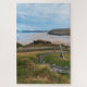 Blick auf den goldenen Sand der Bucht von Perranporth in Cornwall mit dem Millennium Sundial im Vordergrund und dem Gipfel des Kapellrocks mit seiner Cornish Fahne.