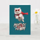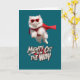 Eine weiße persische Katze fliegt mit einem Kap, der dahinter fließt.