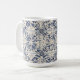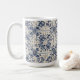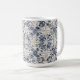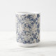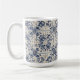 Navy und cremefarbene persische Teppichblütenmuster auf einer weißen Tasse.