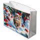 Persische Katze sitzt im Schnee mit Weihnachtshut Große Geschenktüte