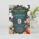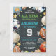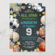 Featuring an All Star design that blends the excitement of various sports, from basketball and soccer to baseball and more, this invitation sets the tone for a day filled with athletic fun and celebration. The vibrant colors and playful graphics make it an engaging and eye-catching choice for your special occasion.
