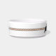 White Keramik Katzenfutter Schüssel hat zwei Katzengrafiken auf jeder Seite des schwarzen Namens Platzhalter. Auf jeder Seite befindet sich ein hellbeige Farbband, das durch ein knisterndes Kreuz-Design ergänzt wird. Ein sehr weiblicher und reglicher Look in einer Katzenschale . Entworfen von HAMbyWhiteGlove.