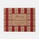 Dieses Thema Tür Matte zeigt Desteis kariertes Muster in Rot und Beige. In der Mitte befindet sich ein beigefarbener Farbbereich mit Text, der "Frohe Weihnachten!" zusammen mit einem personalisierbaren Textfeld für einen Familiennamen lautet.
