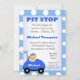 Blue Race Auto mit Namen und Alter des Kindes mit Geburtstag. Thema der Einladung ist Pit Stopp. Sie können sich einfach mit Ihren Party anpassen.