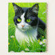 Niedliche Tuxedo Schwarz-Weiß Katze sitzend in einer Wiese von weißen Molsen. Ai Art.