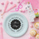 Personalisieren Sie diesen niedlichen Baby Jungen, "sein Junge" duscht kleine Kuchen-Teller, mit blau gingham-karierten Streifen und schwarzem Etikett auf der Innenseite, auf dem steht: "Sein Junge."