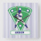 Personalisiertes blau-weiße Baseball-Sternendesign mit einem Schlagzeug, das in einer blau-weißen Baseball-Jersey-Uniform mit einem grünen Baseballfeld-grünen Diamanten mit blauen und weißen Sternen im Hintergrund eine Schwung nimmt. Dies kann mit dem Namen Ihrer Wahl personalisiert sein. Erhältlich in anderen Farben in unserem Shop und wir freuen uns über individuelle Wünsche für verschiedene Farbkombinationen für Ihre Teamfarben. Kontaktieren Sie uns über unseren Shop mit Ihrer Anfrage vor dem Kauf und wir werden uns freuen, sie für Sie zu erstellen.
