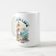 Beach Life Wasserflasche. Illustration einer Strandszene mit Leuchtturm, Surfbrettern, Palmen und Delphin. Geben Sie Namen oder Zitat in den personalisierenden Bereich ein.