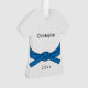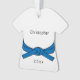Ein blauer Gürtel Karate Weihnachtsschmuck, der mit seinem Namen auf der Vorderseite zusammen mit dem Jahr personalisiert werden kann.