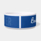 Blauer und weißer personalisierter Hund, Katze oder Haustier-Schüssel mit ihrem Namen in einem lässigen handgeschriebenen Schriftart, Pfotendruck und "Bester Hund je" oder jedes kundenspezifische Sprichwort, das Sie für die Keramik Ihres Haustieres Lebensmittel oder Wasserschüssel gewollt haben.