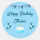 Dieser bezaubernde Einwegaufkleber weist einen weichen blauen Hintergrund mit einem eleganten Geburtstagsthema auf. Das Design umfasst dekorative Bündelfahnen an der Spitze, schwimmende Ballons an beiden Seiten und eine niedliche Geburtstag-Kuchen-Abbildung mit drei Kerzen unten. Der Text "Happy Birthday" ist in einem stilvollen Skript-Schriftart geschrieben, und er ist mit dem Namen "Thomas" personalisiert (der an jeden beliebigen Namen Ihrer Wahl angepasst werden kann). Der Teller vereint Funktionalität und festliche Dekoration, perfekt für Geburtstagsfeiern.