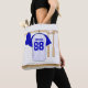 Personalisiertes, blau-weißes Baseballjersey, das in einem Sportsaal mit Baseballkappe, Baseballschlägern und Kugel hängt, der mit Ihrem eigenen Namen und Ihrer eigenen Nummer vollständig angepasst werden kann. Gutes Geschenk für jeden Baseball-, T-Ball- oder Softball-Spieler oder -Fan. Wir freuen uns über individuelle Wünsche für verschiedene Farbkombinationen für Ihre Teamfarben. Kontaktieren Sie uns über unseren Shop mit Ihrer Anfrage vor dem Kauf und wir werden uns freuen, sie für Sie zu erstellen.