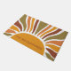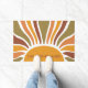Eine fette Retro-Hausmarke mit dem Namen Boho goldene Sonnenaufgang Türmatte mit gelber orangefarbener Terrakotta und Olivgrün Sonnenstrahlen. Kühne und auffällig. Lassen Sie Ihre Gäste in einem kühlen, fröhlichen und hellen Eingangsbereich willkommen.